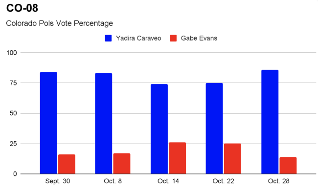 And here is how readers have viewed CO-08, where incumbent Democratic Rep. Yadira Caraveo is trying to hold off Republican Gabe-ish Evans. At no point over the last several weeks have Pols’ readers ever felt like Evans was going to unseat Caraveo.