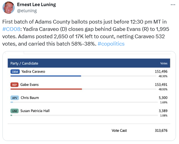 With conservative Weld County mostly done with their counting, all eyes now are on the count proceeding in more populous Adams County to the south where the count has been breaking solidly for incumbent Democratic Rep. Yadira Caraveo. A major problem for those of us trying to track the count updates has been initially inaccurate estimates of the remaining ballots to be counted from both the Weld and Adams clerks, who both have reported and then corrected that all-important figure scrambling both sides’ calculations.