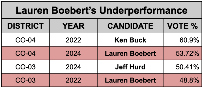 Republican Lauren Boebert moved across the state in late 2023 because it was clear that she would not have been re-elected to Congress in her home district of CO-03; in 2022, Boebert only managed to defeat Democrat Adam Frisch by 546 votes. Boebert’s cross-Colorado move paid off last week when she was elected to the open seat in CO-04 by a margin that wasn’t as comfortable as it should have been.