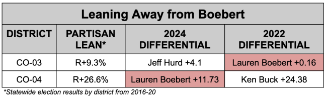We do know the partisan leanings of both CO-03 and CO-04 because of data provided by the Colorado Redistricting Commission in 2021. The differentials between Boebert and non-Boebert Republican candidates are pretty clear:
