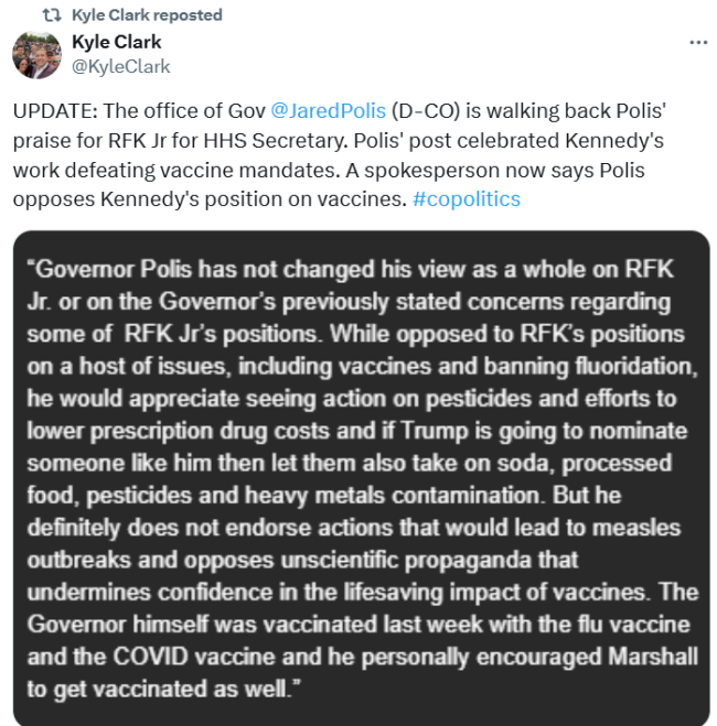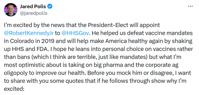 Though most observers with a rudimentary understanding of RFK Jr.’s record agree that he is an almost comically poor choice to serve in any Cabinet position let alone Secretary of HHS, the debate over RFK Jr.’s nomination here in Colorado went sideways yesterday afternoon after Gov. Jared Polis, known despite his general progressive leanings as soft on vaccination requirements, hailed RFK Jr.’s nomination in a rude shock to local and national Democrats lining up to express their disgust: