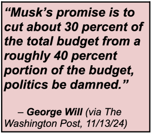 Musk says he can cut “at least” $2 trillion from federal spending — say, one dollar in three. (Fiscal 2024 spending: $6.75 trillion.) Well.