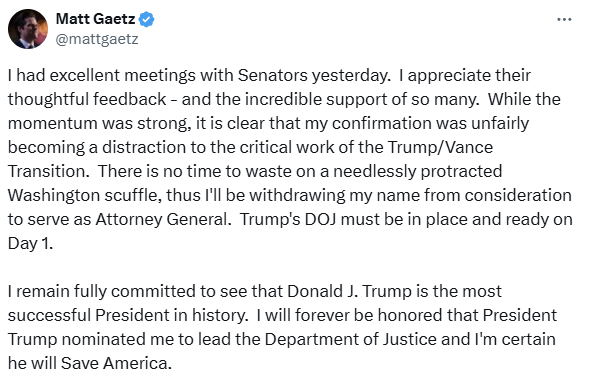 As Tweeted by former Rep. Matt “Giggity” Gaetz moments ago, the congressman best known for being investigated by the Justice Department for sex trafficking will not be the nation’s top law enforcement officer after all: