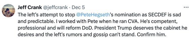 Republican Congressman-elect Jeff Crank (CO-05) is blaming “the left” for problems with the nomination of Fox News personality Pete Hegseth for Secretary of Defense: