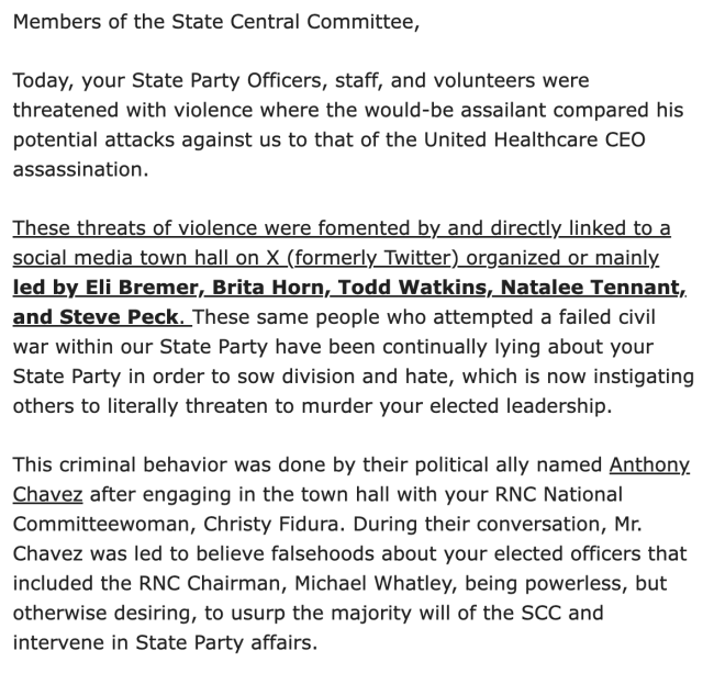 These same people who attempted a failed civil war within our State Party have been continually lying about your State Party in order to sow division and hate, which is now instigating others to literally threaten to murder your elected leadership. [Pols emphasis]