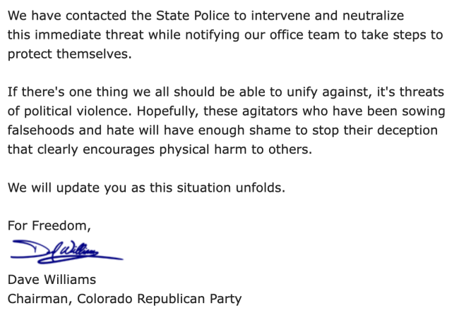 Nah, who are we kidding? Nobody would have thought as much. The metaphorical — and perhaps literal — knives are still out in a State Party that destroyed its own relevancy with a bunch of idiotic calls to action last spring. According to Colorado Republican Party email sent out this week, State GOP Chair Dave Williams says that a fellow “MAGA” believer named Anthony Chavez is threatening he and other Colorado Republicans with violence: