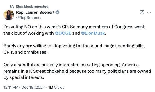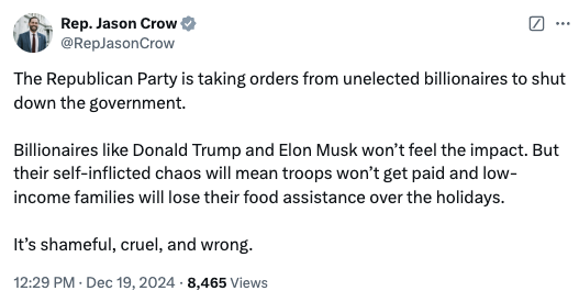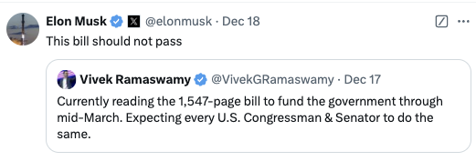 Republicans in Congress are clearly doing the bidding of billionaire Elon Musk, who was tasked by President-elect Donald Trump (along with Vivek Ramaswamy) with finding ways to significantly cut the federal budget through their dorky “DOGE Caucus.” Musk basically singlehandedly destroyed a Continuing Resolution that would have kept the government funded until March by repeatedly posting his demands to “Kill the Bill” (and find Primary opponents for any Republicans who disagree) — all via his social media website: