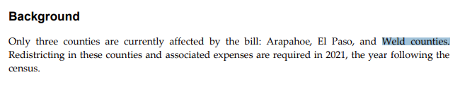 Or, it’s a brazen attempt to minimize the influence of Weld County’s most urban population center by splitting it up among three majority conservative districts. It’s not hard to understand why this is being done, so the question then turns to whether Weld County actually has the power to defy state law and ignore the statute governing the county redistricting process: