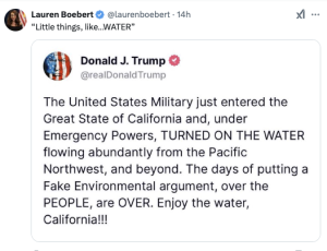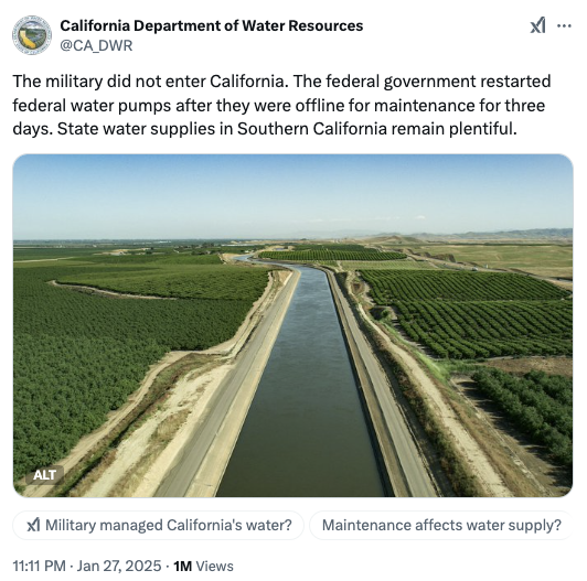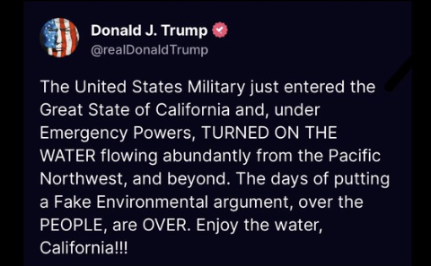 The California Department of Water Resources responded in a statement: “The military did not enter California. The federal government restarted federal water pumps after they were offline for maintenance for three days. State water supplies in Southern California remain plentiful.” [Pols emphasis]