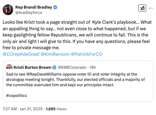 As we discussed last week, no one is sure about Williams’ future as at least two of his lieutenants in party leadership, Darcy Schoening and Hope Scheppleman, have expressed an interest in succeeding Williams in the event Williams gets a job with the Trump administration. Although Williams claims credit for modest gains made by Colorado Republicans in last year’s elections, his detractors argue that those gains came despite the party’s almost complete dysfunction after the primary failed to produce wins for favored candidates starting with Williams personally. On Tuesday, all four Republican members of Congress from Colorado signed a letter opposing Williams’ proposed bylaw changes that would convert them and other elected Republicans to nonvoting members and excommunicate potential opponents in the party’s upcoming leadership elections.