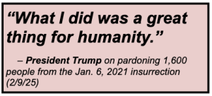 Hurd is now walking back his concerns about Trump’s pardons, claiming that he supports the (original) position of Vice President JD Vance, who was (kinda) against Trump issuing a blanket pardon but then fell in line after it happened. Vance was (originally) concerned about the ugly criminal records of many of those convicted in the insurrection; indeed, several of those people receiving pardons wasted no time getting into trouble again. For example: