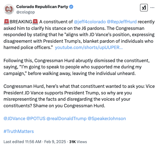 The International Association of Chiefs of Police (IACP) and the Fraternal Order of Police (FOP) do not agree with this perspective, for very obvious reasons. But Republicans in Colorado are too afraid to cross their Orange Overlord in questioning the J6 pardons. Freshman Congressman Jeff “Bread Sandwich” Hurd (R-Grand Junction) told Colorado Public Radio in January that he was “deeply disappointed” by Trump’s J6 pardons. That honesty earned Hurd a stern rebuke from the Colorado Republican Party, which was still attacking him on Sunday: