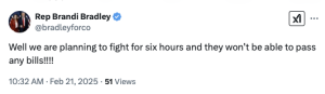 Rather than follow the lead of Senate Republicans, who decided about a week earlier to just vote “NO” on the resolution and not make a stink about it, House Republicans turned most of the day into a performative political circus. State Rep. “Boxwine” Brandi Bradley even made it clear that the micro-minority House Republican caucus was trying to burn away the hours on Senate Joint Resolution 25-006 so that Democrats wouldn’t be able to do actual work for the rest of the day. Bradley’s plan failed; eventually Republicans ran out of nonsense and a vote on the resolution moved forward (with all 22 Republicans voting “NO”).