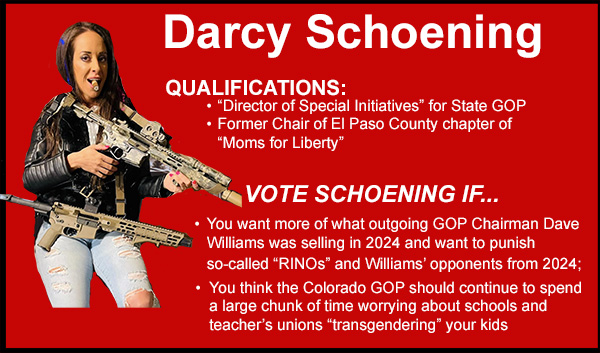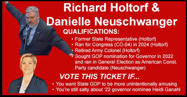 While current Chair Dave Williams isn’t seeking another term (as Colorado Pols first reported earlier this year, Williams is waiting on a job in the Trump administration), the Williams banner is still being carried by the GOP’s “Director of Hating LGBTQ People Special Initiatives” Darcy Schoening. And just last week, another candidate joined the race for State GOP Chair and brought a running mate along with him: Former State Rep. Richard Holtorf is running for Chair alongside former gubernatorial candidate Danielle Neuschwanger, who is seeking the position of Vice Chair.