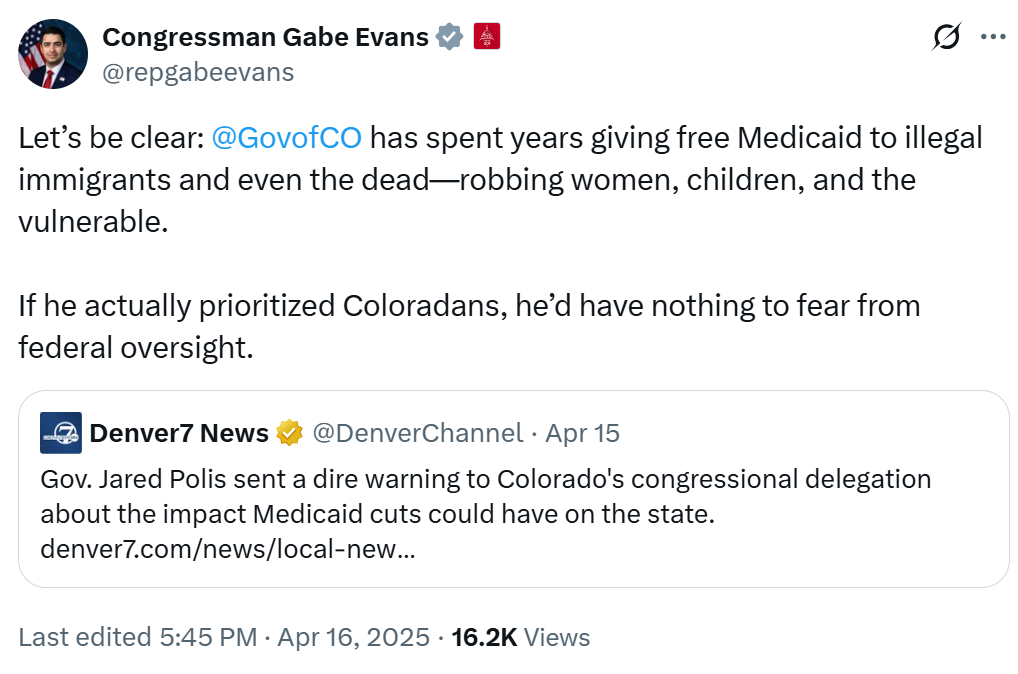 As our readers know, the “Medicaid for the dead and illegal immigrants” canard adds up in reality to an infinitesimal fraction of Colorado’s total $13 billion Medicaid budget. Evans’ fixation on this tiny expense relative to the massive cuts the Energy and Commerce Committee is set to make is a classic example of dishonesty with anecdotes over data. Despite Evans’ insistence that the $880 billion his committee is charged with cutting will come from “across the economy,” every responsible analysis of the resolution says the money can only come from cuts to Medicaid.