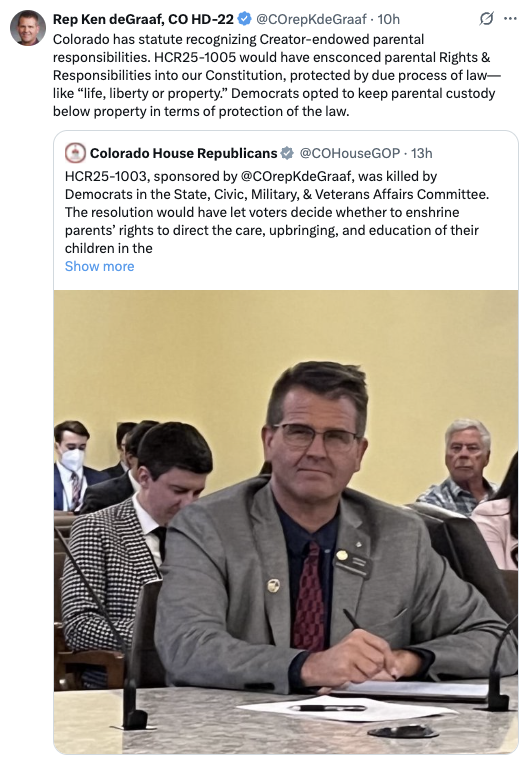 As you can see from DeGraaf’s own post on ‘X’ (which included the wrong bill number), Colorado already outlines parental responsibilities in state statute that is mostly about giving parents the right to choose their own preferred schooling options. But DeGraaf wants to go further, enshrining broader rights in the state constitution so that if you are a parent, you can do pretty much whatever you want with your children.