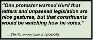 For the most part, Hurd has gone along with whatever House Speaker Mike Johnson and President Trump have demanded of him. Unlike his fellow Republicans from Colorado — Reps. Lauren Boebert, Jeff Crank, and Gabe Evans — Hurd has also shown a willingness to stand up against specific proposals that would inarguably result in significant harm to the people of CO-03. Hurd signed onto a letter, along with several Republican colleagues, opposing any plans to cut Medicaid (roughly one-third of the residents of CO-03 rely on Medicaid for health coverage, the largest percentage of any Colorado congressional district). Hurd has also spoken out in opposition to Trump’s Tariff War, which is causing great harm to agricultural and business interests in Western and Southern Colorado. He’s even been critical of bumbling Defense Secretary Pete Hegseth, who may soon be adding “former” to his title.