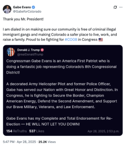 “Congressman Gabe Evans is an America First Patriot who is doing a fantastic job representing Colorado’s 8th Congressional District!” Trump said in a post on the Truth Social site…