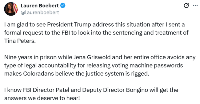 Yesterday evening, a development we’ve been anticipating ever since Donald Trump won a second term as President last November: Trump personally weighed in on the case of convicted Mesa County Clerk Tina Peters, who is serving a nine year sentence in Colorado state prisons for her role in a failed scheme to hack voting machines in her charge hoping to prove the 2020 presidential election was somehow stolen. After Trump’s re-election ended the federal criminal case against him for attempting to overturn the results of the 2020 elections and the pardoning en masse of even violent insurrectionists who stormed the U.S. Capitol on January 6, 2021, Tina Peters is now the only person doing time for crimes stemming from Trump’s refusal to accept defeat.