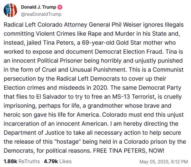 “FREE TINA PETERS, NOW!” Trump wrote to punctuate the message…