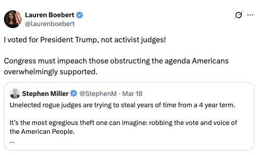 The Trump administration has run into numerous legal challenges as it tries to enact various policy changes, particularly in the areas of immigration policy and in relation to massive cuts to government agencies. Americans largely agree with the idea that we should have a functioning Judicial Branch in this country and that the President should have to abide by the separation of powers laid out in the U.S. Constitution. But Republicans — including noted Constitutional scholar Rep. Lauren Boebert (R-Weld County) — want to allow Trump to govern like a dictator.
