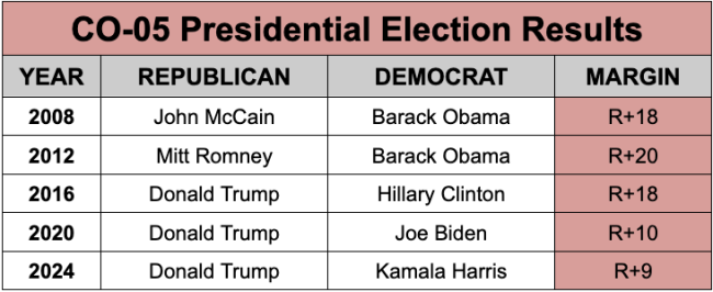 [Fun Fact: Colorado has eight congressional districts, and CO-05 is one of three that has only ever elected a representative from the same political party. The fifth congressional district has never elected a Democrat, while voters in CO-01 (Denver) and CO-02 (Boulder area) have never elected a Republican.]