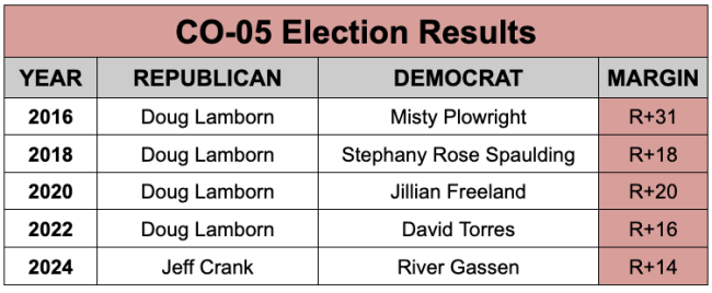 In 2024, as the vast majority of the country moved to the right on the presidential level, the 5th District was one of just 19 in the nation that moved leftward compared to four years earlier. [Pols emphasis] And two years before that, Democratic Gov. Jared Polis lost the district by just a 50-47 margin, according to Bloomberg’s Greg Giroux, en route to winning a second term in a 59-39 blowout.