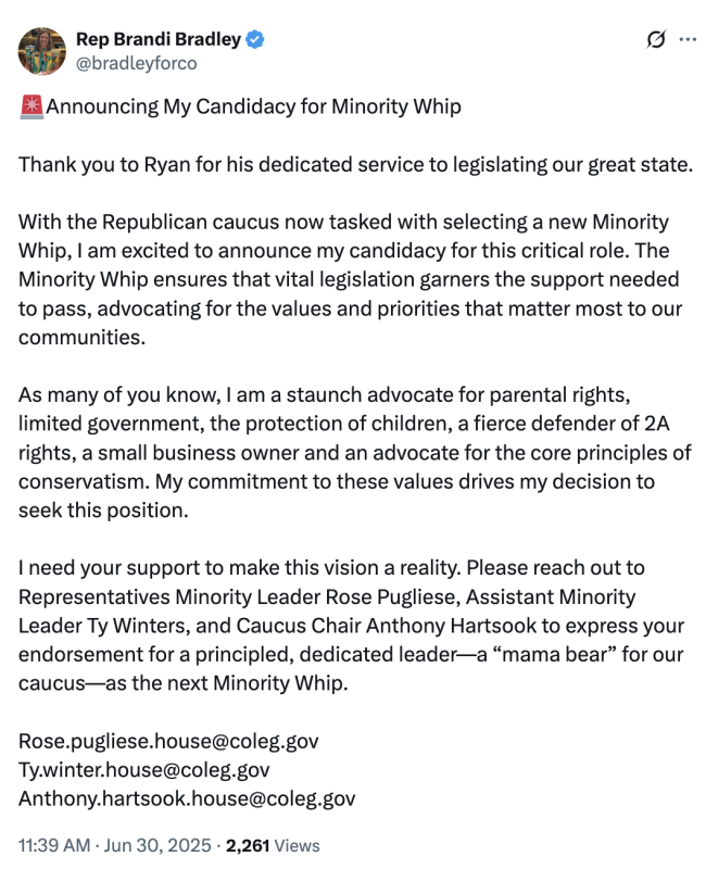 Armagost’s decision to bounce from the Colorado legislature was likely spurred in part by the ridiculous attacks recently levied against him by Rocky Mountain Gun Owners (RMGO), the silly no-compromise gun rights group that has long attacked Colorado Republicans viewed to be insufficiently obedient. Following the 2025 legislative session, RMGO labeled Armagost its “RINO of the Session” (Republican in Name Only) — despite the fact that Armagost is such a 2nd Amendment enthusiast that he regularly wears assault rifle pins on his jacket…and his tie.