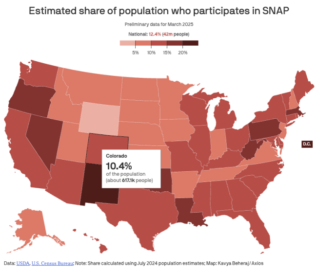By the numbers: More than 617,000 Coloradans, about 10% of the state, were enrolled in SNAP as of March 2025, per federal data. [Pols emphasis]