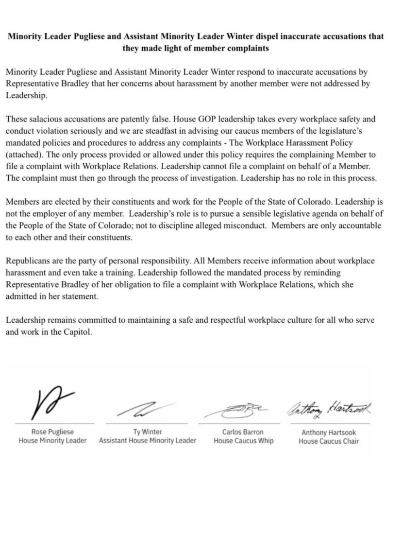The House Minority office issues a statement to the press signed by caucus leadership disputing Bradley’s claim that she had previously complained about Weinberg’s behavior in the legislature. Bradley is mad about this.