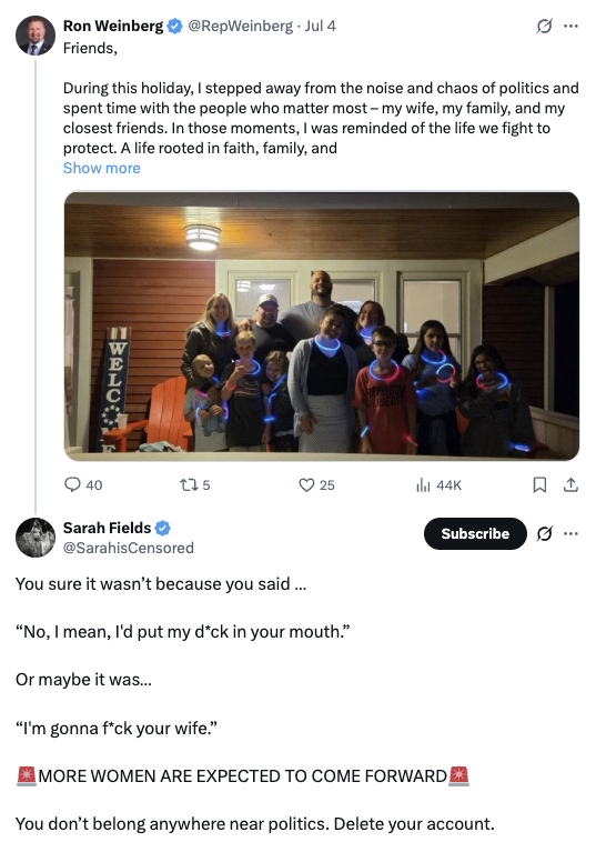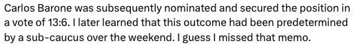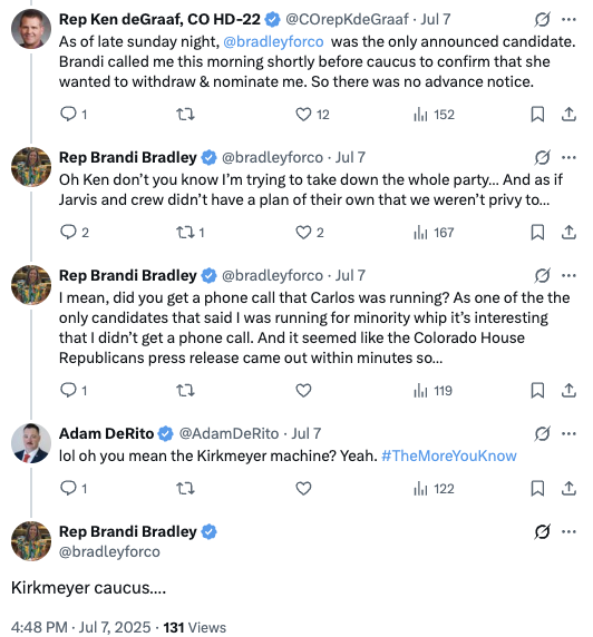Meanwhile, Rep. DeGraaf alleges via ‘X’ that the election for House Minority Whip was rigged and the real vote took place before the official meeting on Monday, July 7 (DeGraaf misspells the name of Carlos Barron):