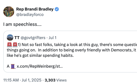 For example, one of the more outspoken House Republicans, Rep. “Boxwine” Brandi Bradley, has learned from experience that she can do and say pretty much whatever she wants without repercussions. In the 2025 legislative session, Bradley clashed with freshman Rep. Dusty Johnson (R-Fort Morgan) over several policy issues. As Colorado Public Radio reported, Bradley aggressively attacked and threatened Johnson online, saying things like, “[Johnson] wouldn’t know how to spell liberty and freedom if she had a cue card in front of her.”