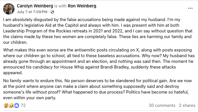 Weinberg’s wife, Carolyn, publicly defends her husband and disputes the sexual harassment allegations.
