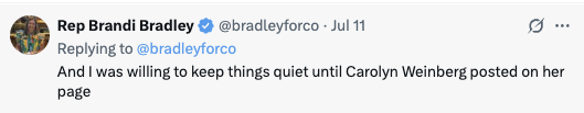 Bradley later seems to threaten Rep. Jarvis Caldwell (R–Colorado Springs) with a Republican Primary challenge for reasons that aren’t entirely clear’. Bradley also goes after Rep. Lori Garcia Sander (R-Eaton) for supporting Weinberg.