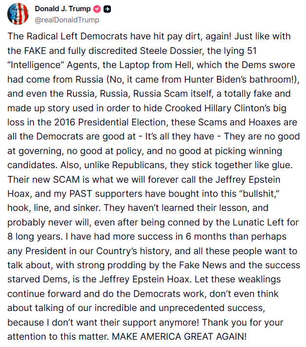 “Their new SCAM is what we will forever call the Jeffrey Epstein Hoax, [Pols emphasis] and my PAST supporters have bought into this ‘bull—-,’ hook, line, and sinker,” Trump vented in a Truth Social post.