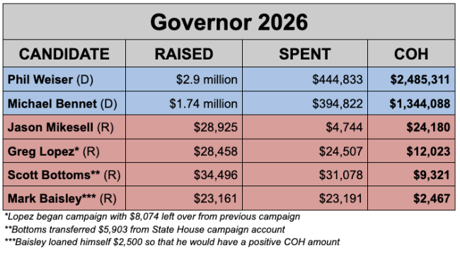 On the Republican side, it should come as no surprise to learn that none of the candidates are raising any real money. The most interesting number here is that of State Sen. Mark Baisley (R-Roxborough Park), who was the first recognizable name from either party to make his 2026 intentions known. We already knew that Baisley was not going to be Colorado’s next Governor, but we’re still surprised that he has a piddly $2,500 in the bank after nine months as a candidate. At this rate, Baisley will have enough money to run a television commercial sometime in the year 2034.