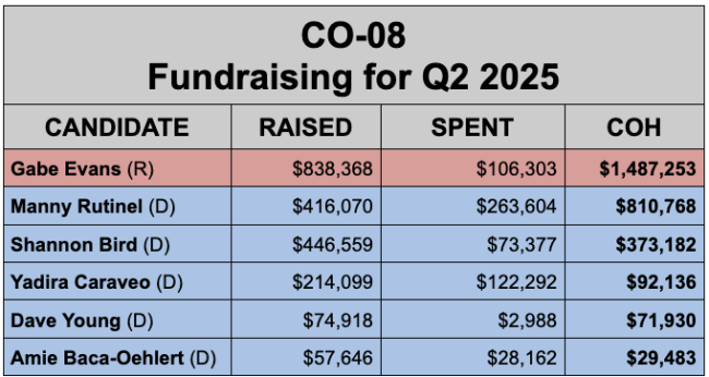 Congressman Gabe Evans (R-Ft. Lupton) is right where he should be given his stats as perhaps the most endangered incumbent Republican in the country; he’s raising good money and maintaining a small burn rate.