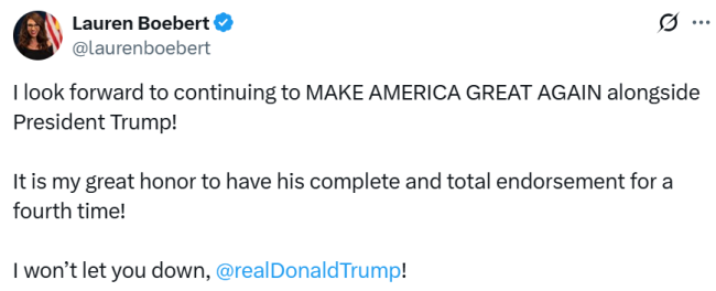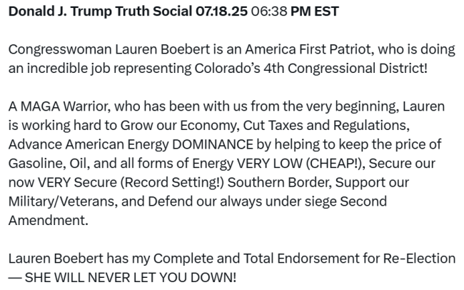 After holding out past Trump’s demand to purge Jeffrey Epstein from the MAGA memory banks and continuing to call for a special prosecutor to take another look at Attorney General Pam Bondi’s handling of the case, Colorado’s foremost Epstein conspiracy-familiar congresscritter Rep. Lauren Boebert has gone completely silent on the matter since late last week–just so happening to coincide with an out-of-the-blue endorsement by Trump of a 4th term for Boebert Friday evening!