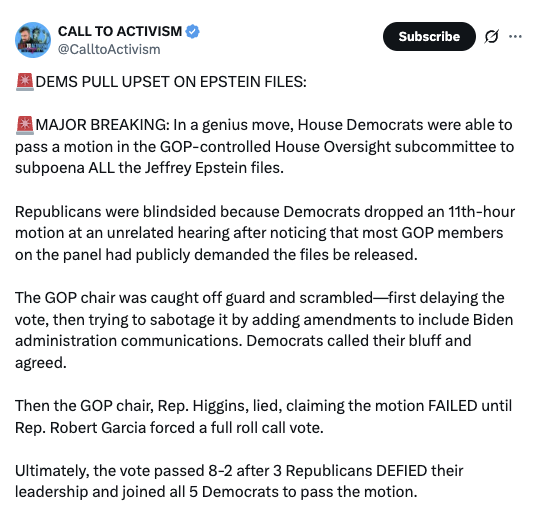 Now that three House Republicans have formally voted to subpoena the Epstein files, and another (Rep. Thomas Massie of Kentucky) is pushing a discharge petition to force a floor vote on the issue, it will be fascinating to see if other Republicans — including Boebert — will start to fold on a subject that is making them very unpopular with the MAGA base. The coverup is quickly becoming as big an issue as the Trump-Epstein relationship itself; how long will Congressional Republicans wait before abandoning this sinking ship?