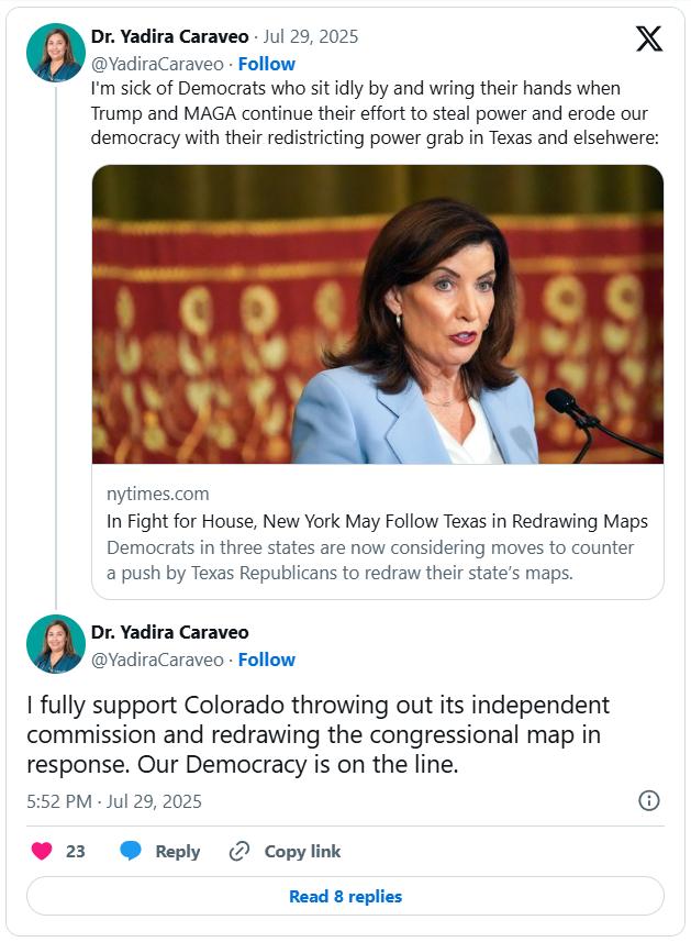 Yesterday evening, CO-08 Democratic congressional candidate and former Rep. Yadira Caraveo weighed in on this contentious question, calling for Colorado to “throw out” the independent redistricting commissions established in 2018 by Colorado voters with the passage of Amendments Y and Z: