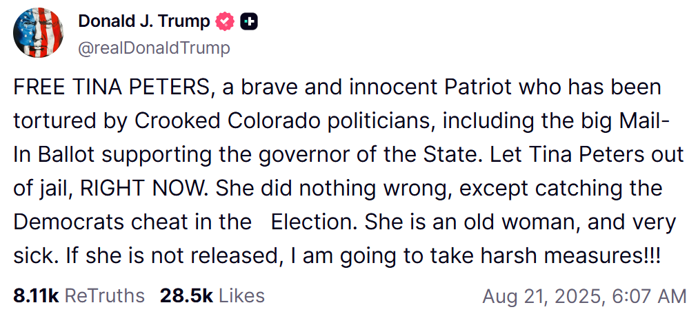 In a Truth Social post today, which we’re supposed to refer to simply as a “Truth” but for self-evident reasons we decline, President Donald Trump issued the most direct threat yet against the state of Colorado over the incarceration of convicted felon former Mesa County Clerk Tina Peters. Peters, as readers know, was sentenced to nine years in prison last October for orchestrating a breach of security via identity theft to allow unauthorized persons access to Dominion Voting Systems equipment, in a failed attempt to generate evidence supporting Trump’s false claims that the 2020 presidential election was decided unfairly. Since retaking the White House and pardoning the January 6th insurrectionists, Peters’ case has stood out as one of the only residual consequences of Trump’s failed coup attempt that he doesn’t have the power to make go away.