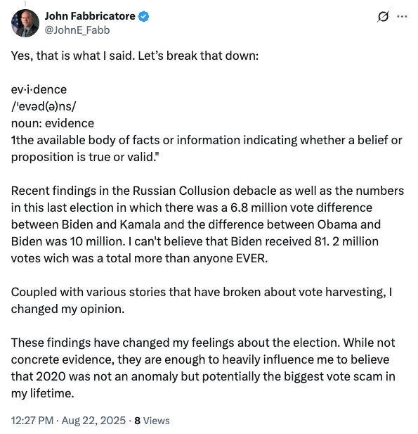 Asked on X to clarify whether “massive fraud” meant that the 2020 election was stolen from Trump, Fabbricatore replied that “recent findings” had convinced him that Trump won.