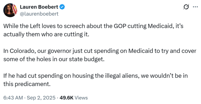 But sometimes this instinct to engage early and often comes back to burn Boebert, like this morning, as Boebert tried to shift the blame for the cuts to Medicaid coverage announced by Gov. Jared Polis last week following the special session of the state legislature to address the federal “We’re All Going To Die Act” budget that Boebert herself voted for: