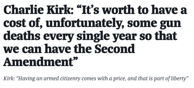 Charlie Kirk was right: If Americans want to continue to have such ridiculously-open access to murderous weapons out of some weird obsession with the Second Amendment, then they absolutely must accept the devastating impact of gun violence.