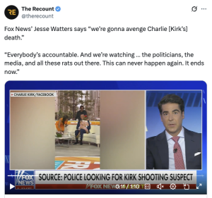 In the aftermath of Wednesday’s killing of right-wing media figure Charlie Kirk during an event at Utah Valley University in Orem, Utah, there has been an endless stream of irresponsible chatter online (and at Fox News) about “political violence” and the United States reaching a “turning point” on the issue — including some disturbing suggestions about “retribution” from those on the political right.