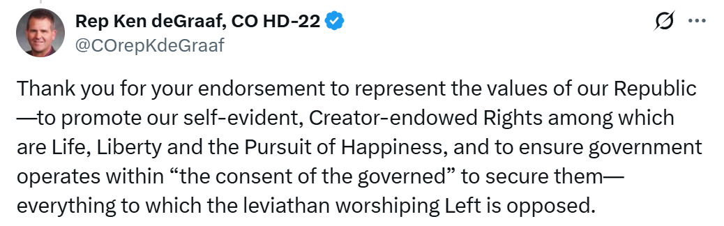 Despite his profound unsuitability for improving the Colorado House GOP’s public image, DeGraaf does have support in the caucus, with Rep. Brandi Bradley quick to endorse his run for Minority Leader. With no real power to change the legislature’s course on any issue, the question for the GOP caucus is whether they want to even try to work across the aisle to accomplish shared goals–or just make obstructionist noise until the majority is forced to procedurally shut them down over and over again.
