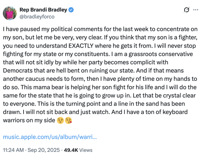 Suckla’s comments were likely shared by at least a few of his fellow Republicans. Following the vote on Saturday, Rep. “Boxwine” Brandi Bradley voiced her displeasure with her caucus for apparently not electing a more, um, controversial candidate as Minority Leader: