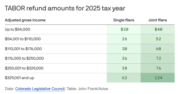 Refunds for the upcoming 2026 tax-filing season are projected at $20 for low-income Coloradans and up to $30 for Coloradans making between $110,000 and $176,000 in income. The highest-income Coloradans can expect $62 refunds. [Pols emphasis]