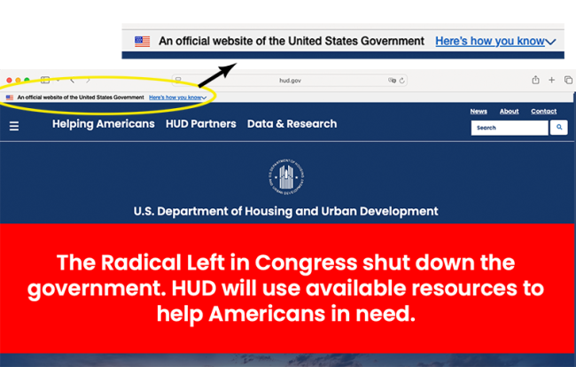 Ahead of Wednesday’s government shutdown, the U.S. Department of Housing and Urban Development on Tuesday posted a banner in large type on its homepage blaming the shutdown on the “Radical Left,” an allegation that an ethics group said was a “blatant violation” of the Hatch Act.