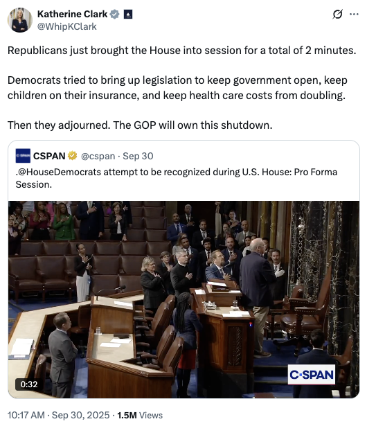 The Trump administration is trying hard to reshape public opinion on the shutdown, given that Republicans are getting most of the blame in recent polling. Trump is no doubt sensitive to the fact that he was President during the longest government shutdown in American history (Dec. 22, 2018, to Jan. 25, 2019), which ended when TACO Trump caved on his demands to fund construction of a wall along the southern border. It is also patently absurd to suggest that Democrats should be to blame for a shutdown when Republicans control both chambers of Congress and the White House.